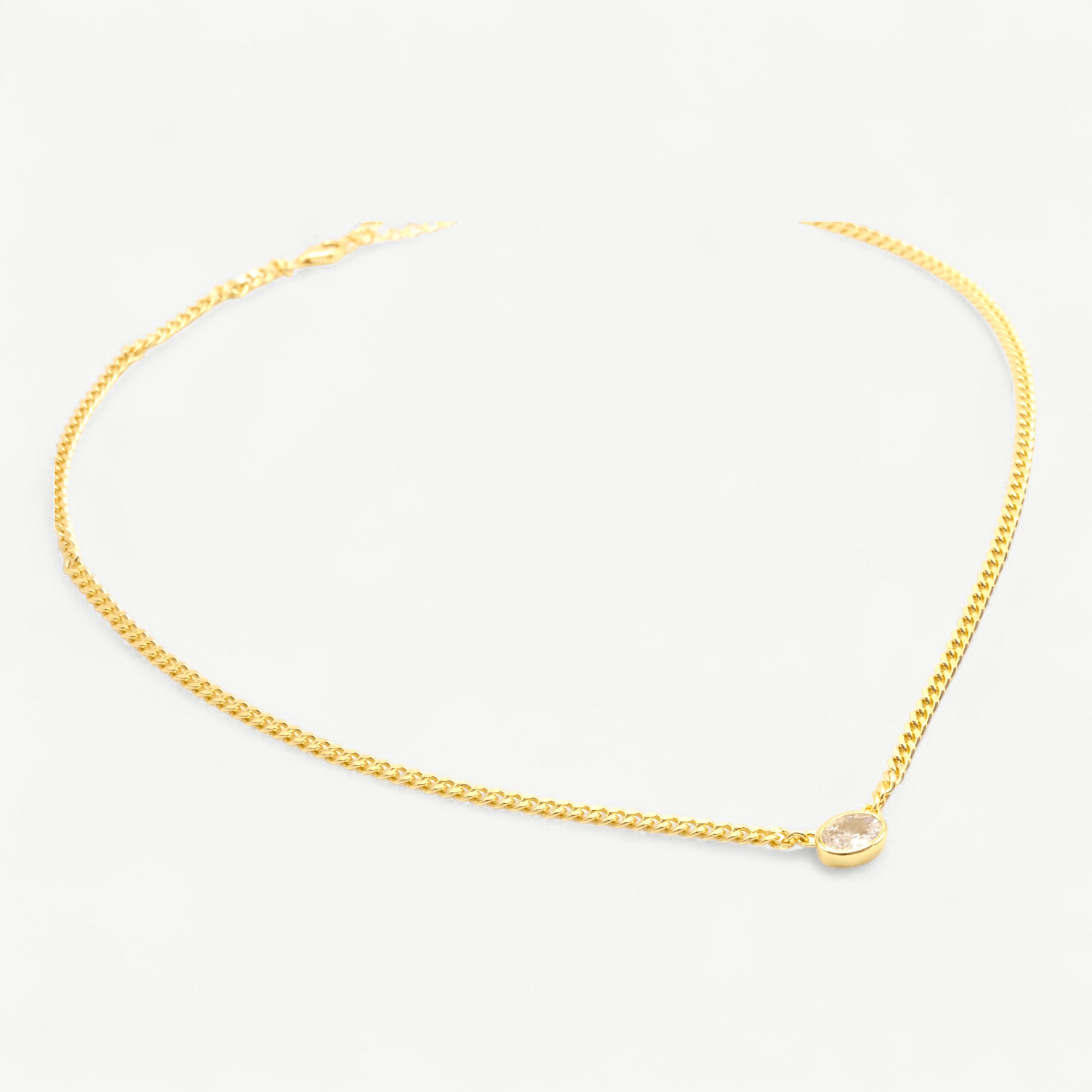 This necklace features a stunning oval-cut cubic zirconia set in a sleek, minimalist design. Radiating subtle brilliance, it looks beautiful worn solo or paired with other pieces. Crafted without nickel, it ensures comfortable all-day wear, making it an essential addition to any jewellery collection.