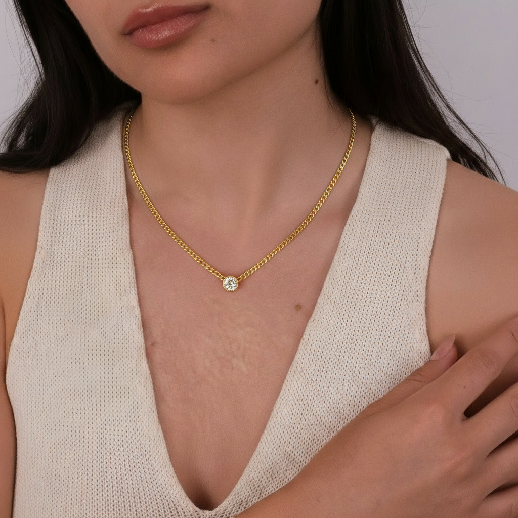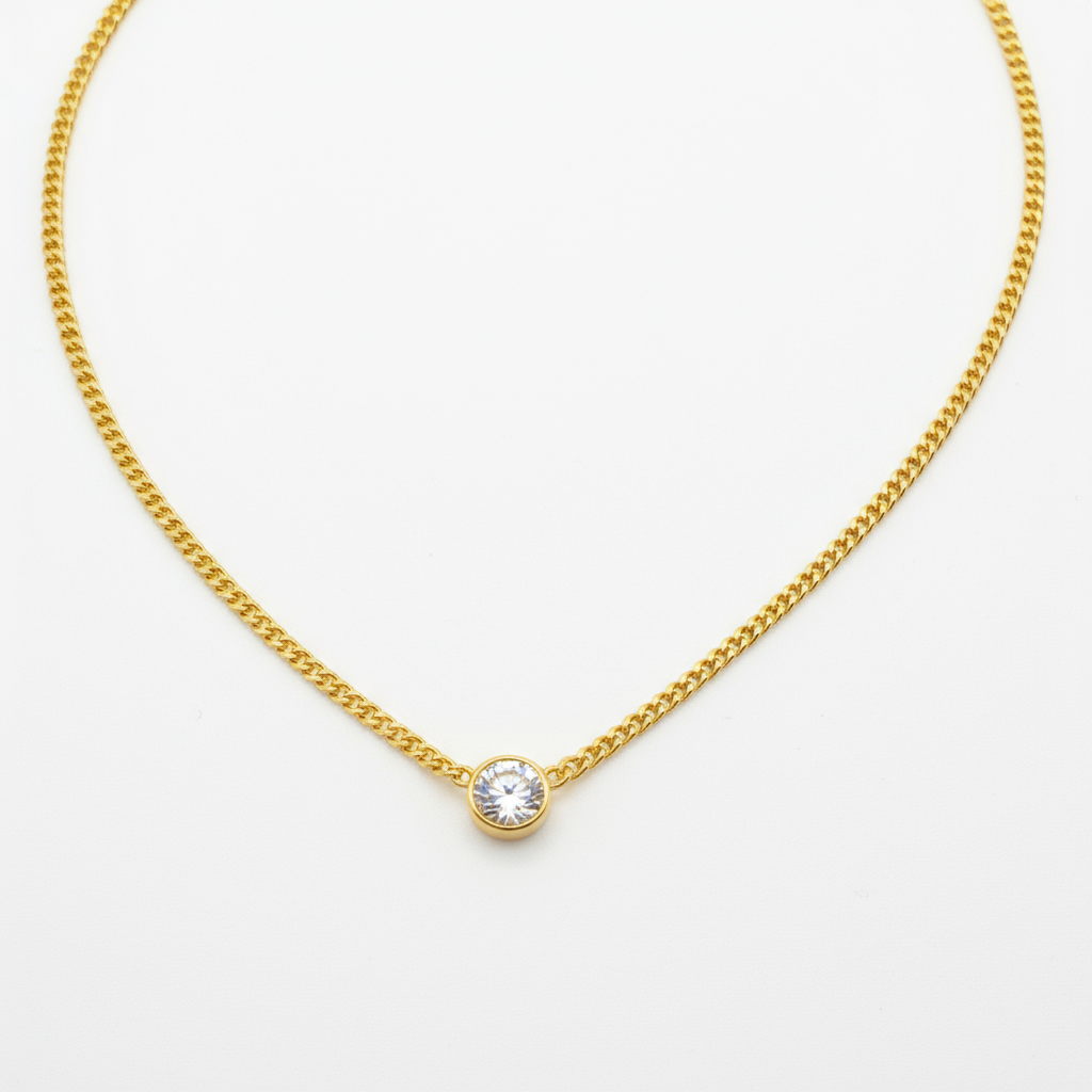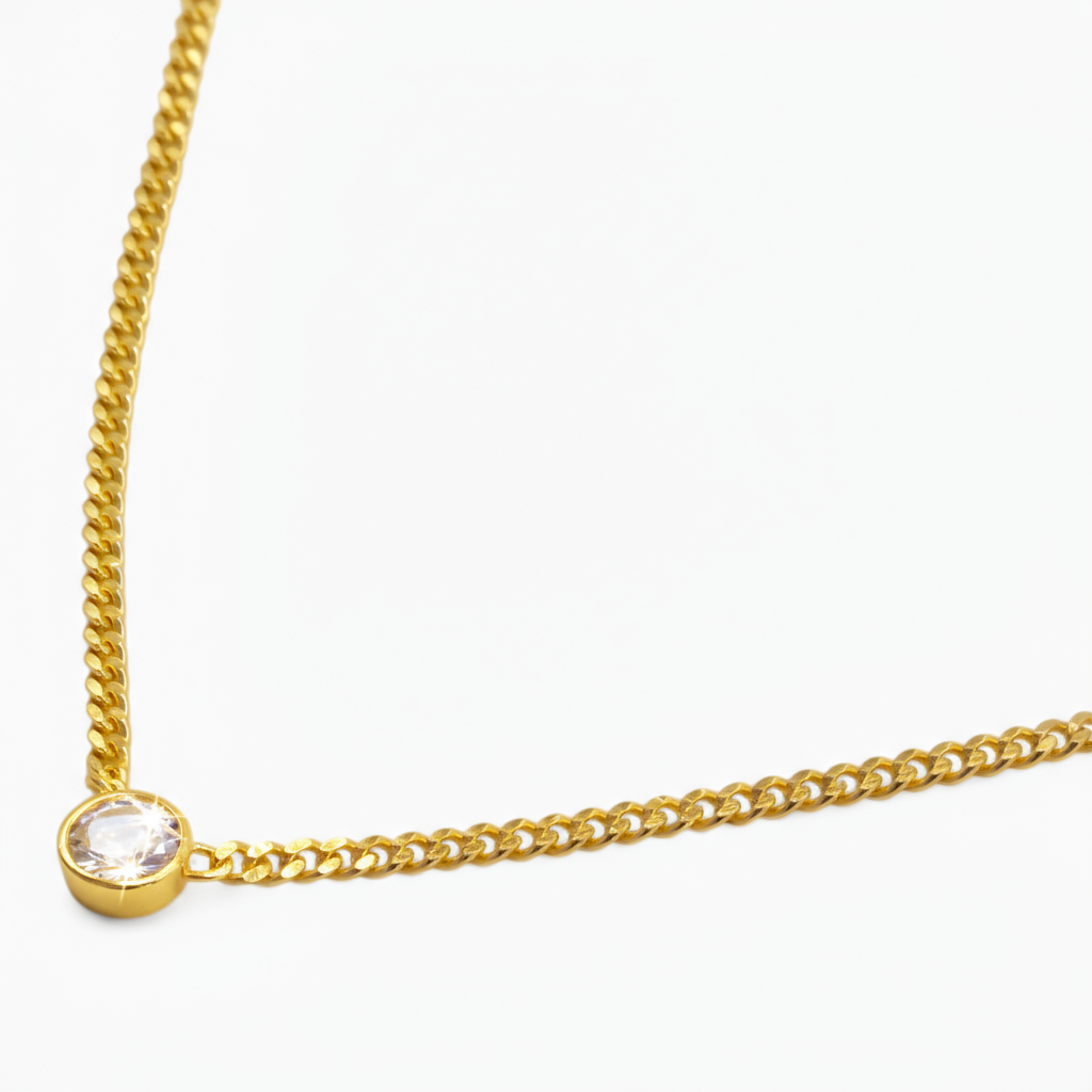 This necklace features a single round cut Cubic Zirconia - clean and crisp. Bringing the vintage charm into the now. Perfect to wear alone or for stacking with our other necklaces. Comfortable, nickel-free, and suitable for daily wear.