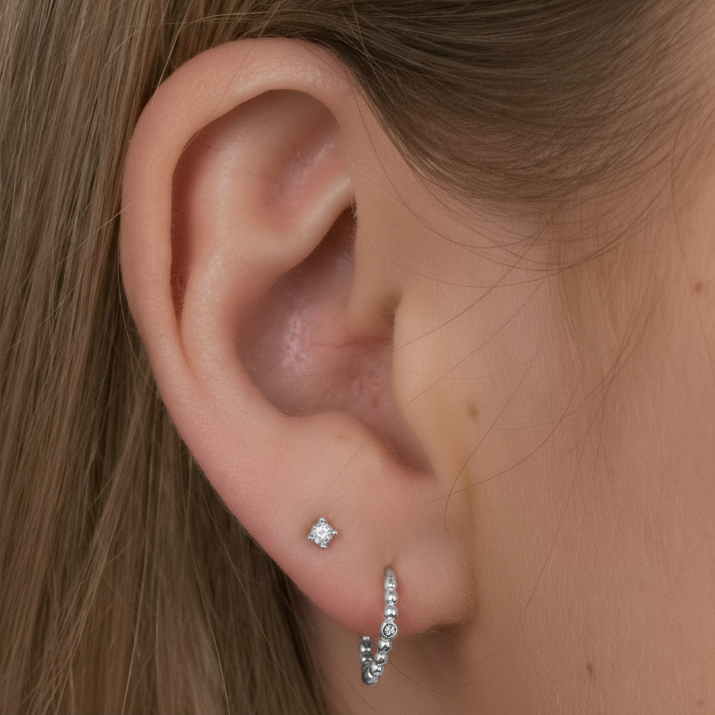 Stylish hoops with a lively twist — our Beaded CZ Huggies feature detailed beadwork combined with a subtle Austens cubic zirconia stone that adds just the right amount of sparkle. Made for all-day comfort, they provide a refined and eye-catching touch to any outfit. Perfect for enhancing your daily look with effortless elegance.