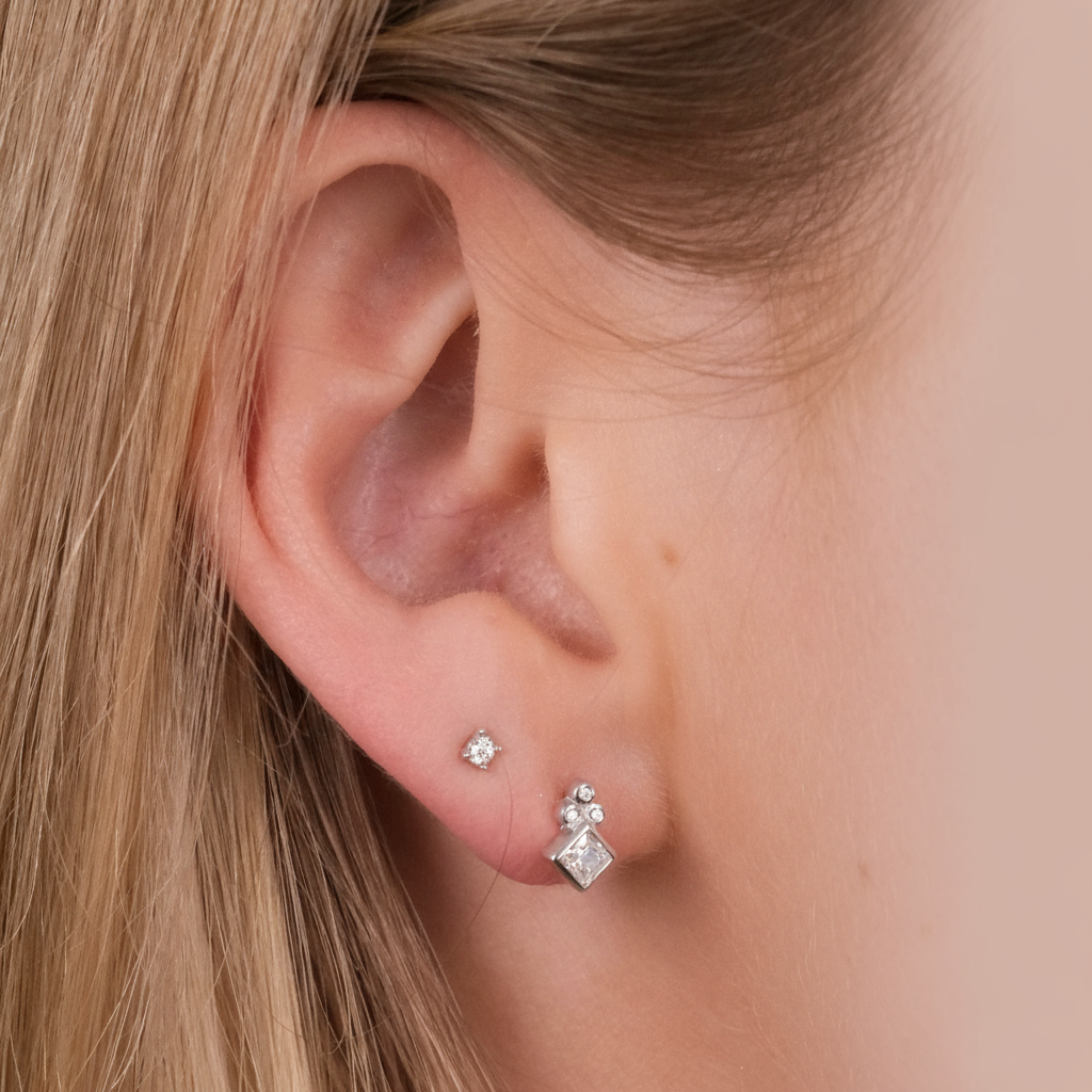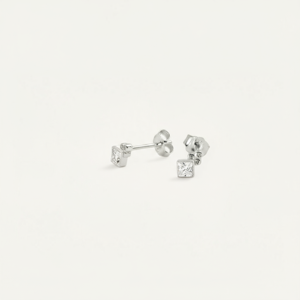 Each earring features one square-cut and three round-cut cubic zirconia stones specially selected by Austens. Ideal for layering with other studs and hoops, these earrings offer comfort, are nickel-free, and designed for everyday use.