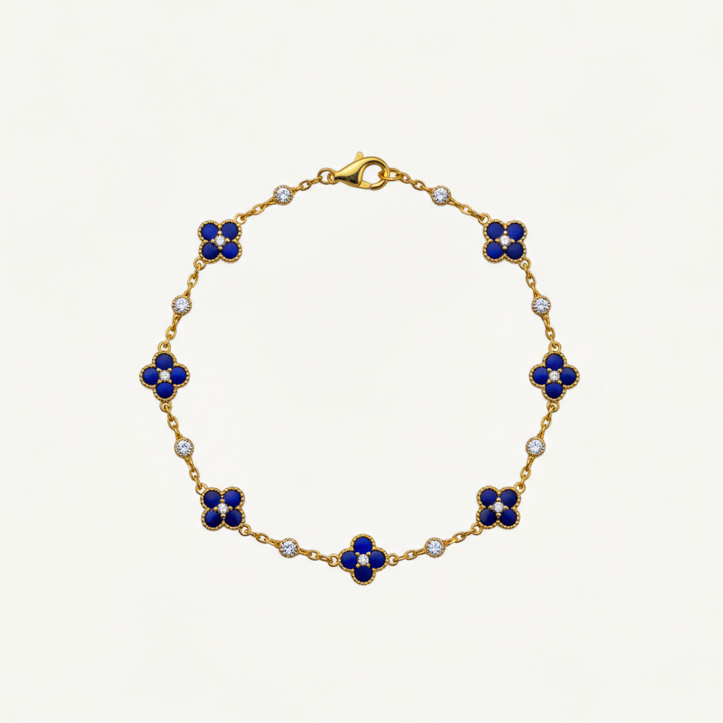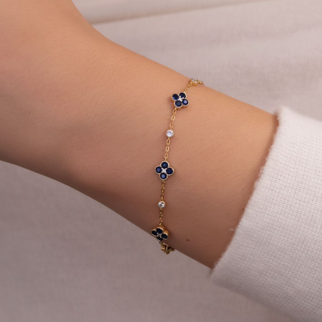 This classic bracelet showcases delicate blue clovers combined with sparkling specially selected Austens cubic zirconia stones. It delivers the ideal mix of colour and brilliance to enhance your everyday elegance. Nickel-free and designed for all-day comfort, it’s perfect for daily wear.