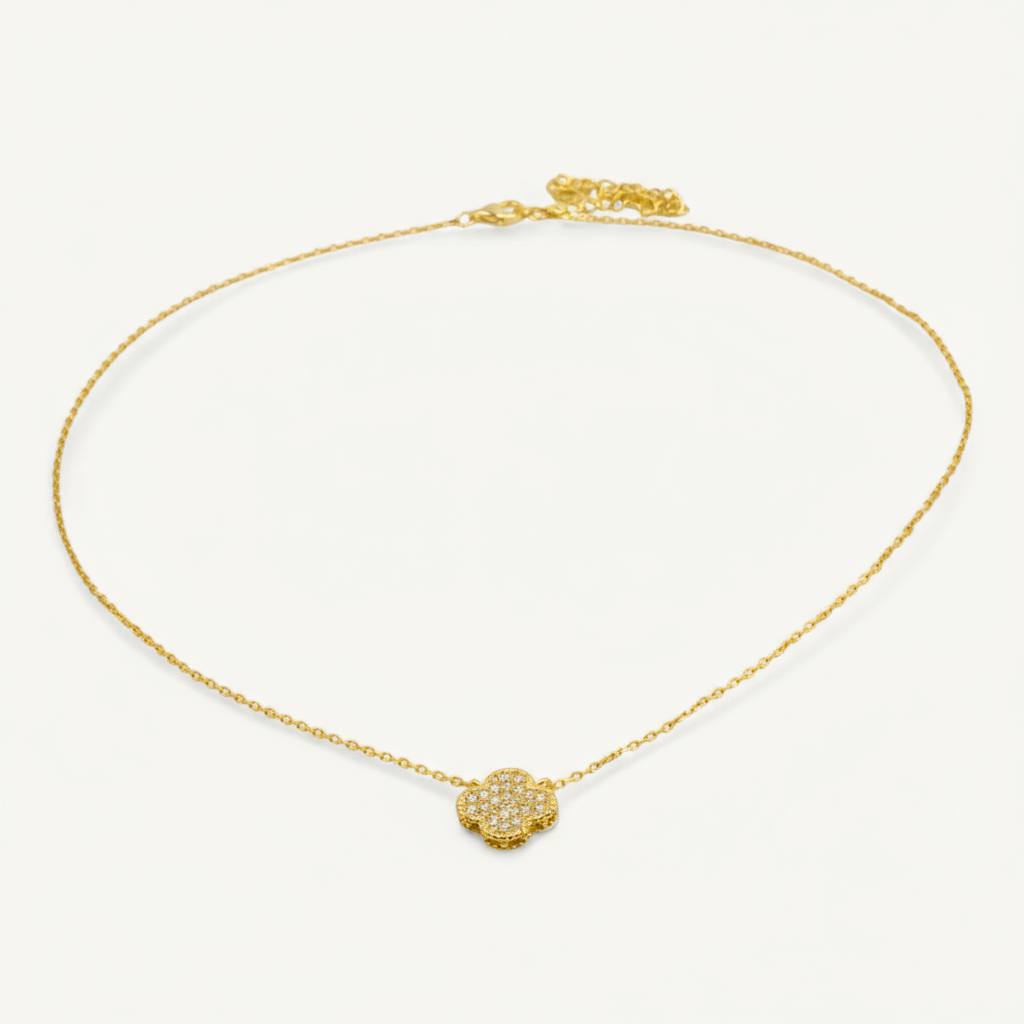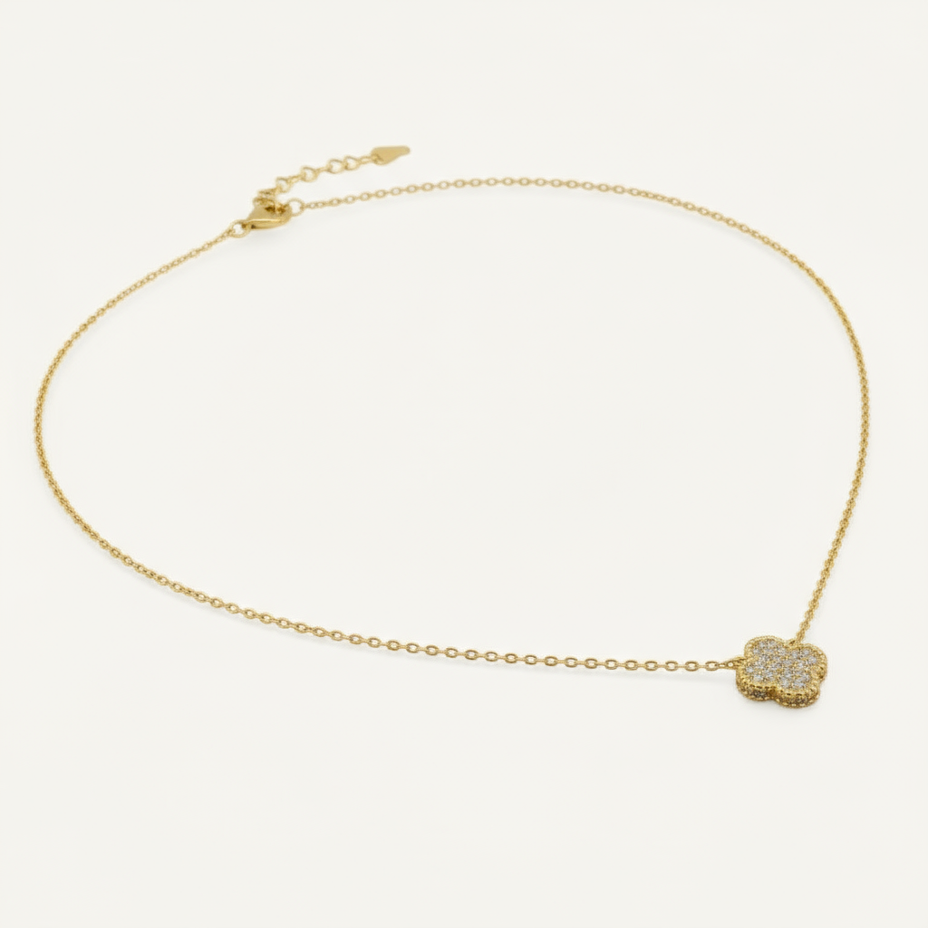 Delicately crafted with a detailed clover covered in Austens specially selected Cubic Zirconia stones. The fine chain necklace adds a touch of elegance. Comfortable, hypoallergenic, and suitable for daily wear.